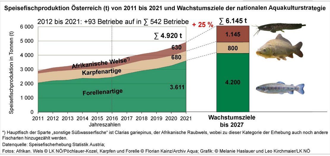 - Indoor-Kreislaufanlagen: 630 Tonnen Afrikanische Raubwelse (Trend: Produktion wächst kontinuierlich, +56% von 2016 bis 2020); 2021 haben 20 Kreislaufanlagen eine Produktion mit Marktwert bei der Speisefischerhebung der Statistik Austria gemeldet
