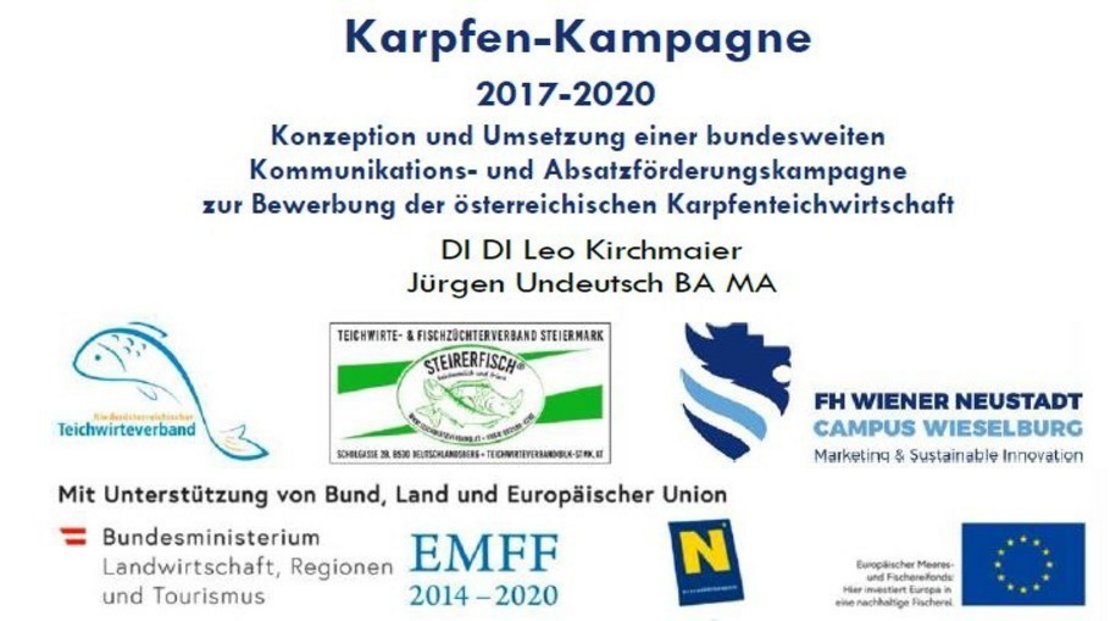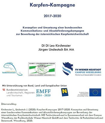 Kirchmaier L., Undeutsch J. (2020): Karpfen-Kampagne 2017-2020. Konzeption und Umsetzungeiner bundesweiten Kommunikations- und Absatzförderungskampagne zur Bewerbung derösterreichischen Karpfenteichwirtschaft. NÖ Teichwirteverband in Zusammenarbeit mit dem CampusWieselburg der Fachhochschule Wiener Neustadt GmbH und dem Teichwirte- & FischzüchterverbandSteiermark. Wieselburg, 2020.
