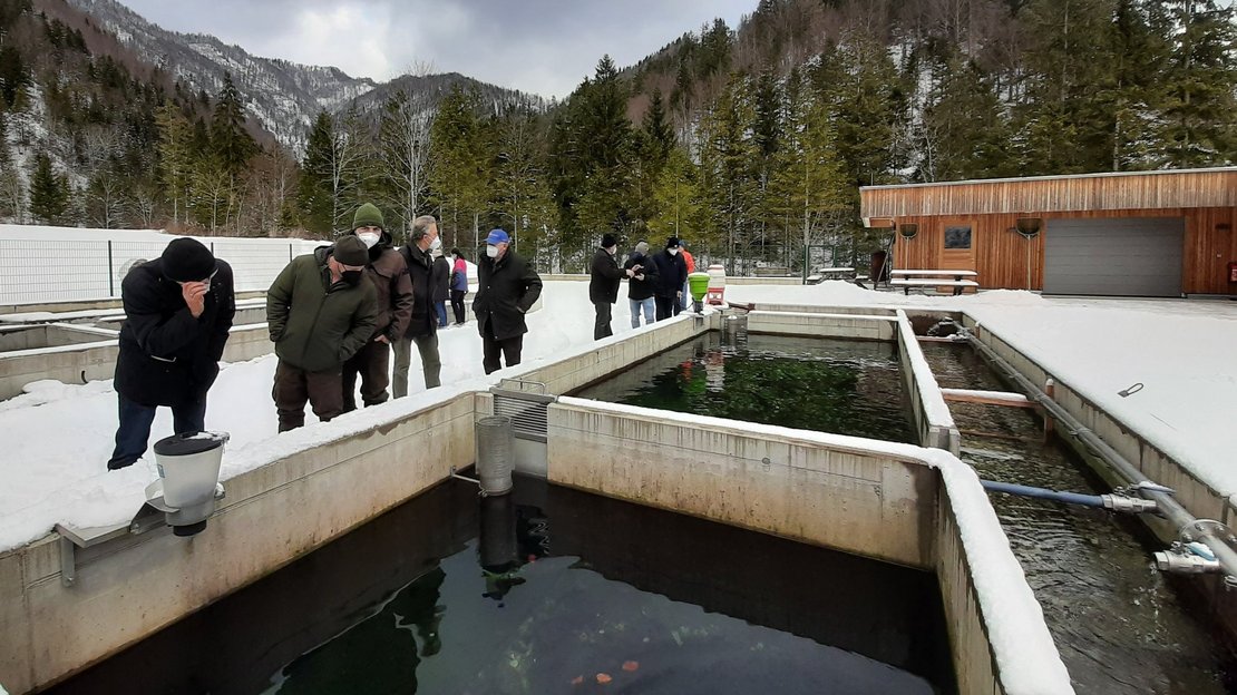 Direktor Leo Klaffner begrüßte als Gastgeber die 17 Teilnehmenden mit den Worten: „Es freut mich besonders, erstmals einen Forellenkurs bei uns abzuhalten. Der Zeitpunkt ist ideal, da man derzeit die Fischentwicklung vom Ei bis zum frisch geschlüpften Brütling im Bruthaus sehen kann.“ Das Bruthaus war definitiv eines der Highlights der Weiterbildungsveranstaltung. Ein Teil der Setzlinge wird nämlich für den eigenen Besatz vor Ort erbrütet und aufgezogen. Eier mit Augenpunktstadium, frisch geschlüpfte Dottersackbrut und kleine Brütlinge konnten begutachtet werden. Durch die Anlage führte Thomas Pechhacker, der ganzjährig die Anlage betreut und Praxiswissen aus erster Hand weitergab. Im Schlacht- und Verarbeitungsraum durften die Teilnehmenden dann selbst Hand anlegen und unter fachkundiger Anleitung durch Fachschullehrer DI Paul Egger Saiblinge filetieren. Vorab gab es natürlich die Theorie zur Praxis. Melanie Haslauer von der Landwirtschaftskammer NÖ erklärte alles Wissenswerte rund um die bäuerliche Forellenproduktion und die rechtlichen Vorgaben. Ein Foto- und Videovortrag von Fachlehrerin Helga Blaimauer gab Einblicke in die fachgerechte Fischvermehrung.