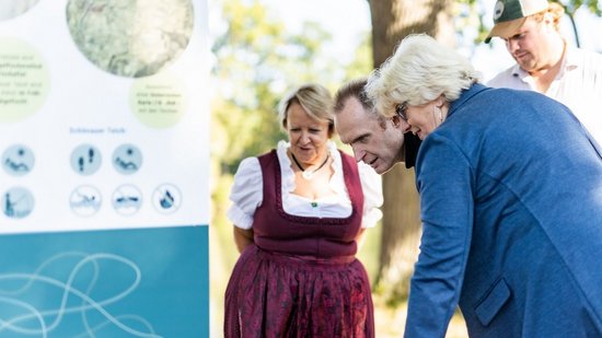 Mehr und mehr rücken die Teiche mit ihren vielfältigen positiven Ökosystemdienstleistungen in den Fokus der Wissenschaft und damit auch der Öffentlichkeit - so lautete die Botschaft. „Es geht uns nun darum, auch direkt vor Ort darüber zu informieren wie Teichwirtschaft funktioniert, welch schmackhaftes und gesundes Lebensmittel produziert wird und dass es die Bewirtschaftung braucht, diese vielfach jahrhundertealten Teichökosysteme aufrecht zu erhalten“, so die Teichwirtevertreter Andreas Kainz und Franziskus Seilern-Aspang. Im Konkreten leisten Teiche einen wertvollen Beitrag für das Mikroklima durch die Verdunstungsleistung, halten wertvolles Wasser in der Landschaft zurück – gerade auch in Hitzeperioden, bieten vielen oftmals gefährdeten Tier- und Pflanzenarten einen Lebensraum und erhöhen damit die Biodiversität in unserer Kulturlandschaft. Mehr und mehr werden die landschaftlich so ansprechenden Teiche auch als Alleinstellungsmerkmal unserer Region erkannt. Mit dem Karpfen als Leitprodukt wird zudem ein regionales, schmackhaftes und sehr gesundes Lebensmittel produziert. Neueste Forschungsergebnisse lassen auch über die Insektenwelt der Teiche aufhorchen. „So werden, hochgerechnet für alle Karpfenteiche des Waldviertels, rund 30 Tonnen an Insekten im Jahr produziert“ berichtete Kirchmaier über die neuesten Forschungsergebnisse einer Arbeitsgruppe der interuniversitären Forschungseinrichtung des WasserClusters Lunz.
