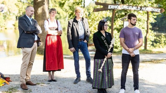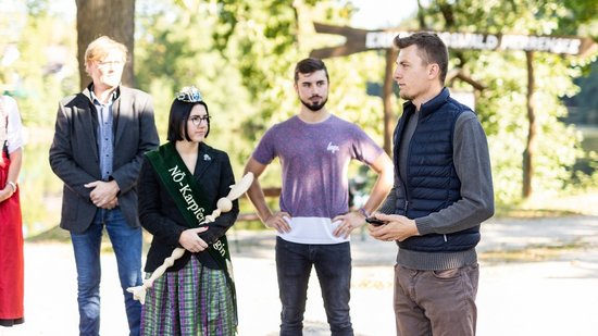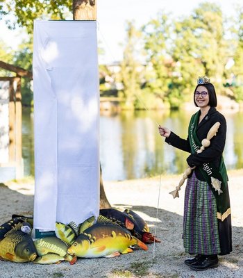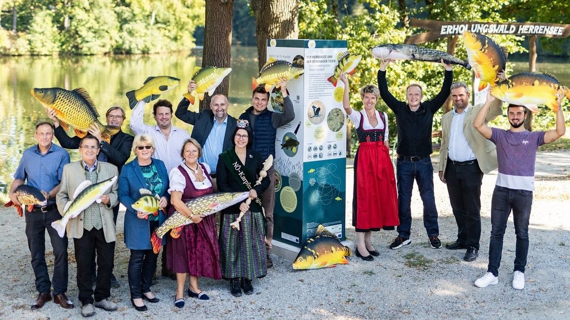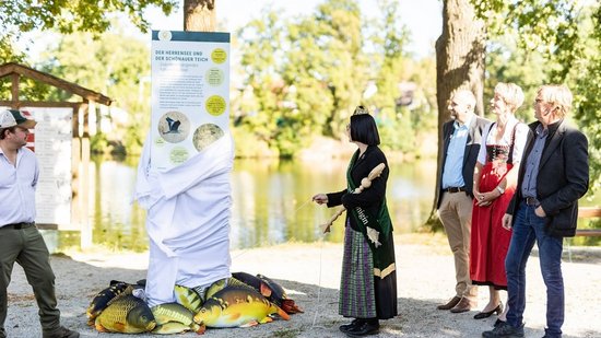 Niederösterreichs Karpfenkönigin Luna I. nahm die feierliche Enthüllung der innovativen Spiel- und Informationstafel am Standort „Herrensee“ vor. Eingeweiht und eröffnet wurde der Infopoint dann im Anschluss mit dem Karpfenzepter.