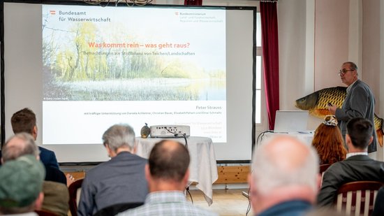 Innovative Ergebnisse eines Forschungsprojektes zur Bewässerungsteichwirtschaft stellte Jan Masilko vom Institut für Fischerei der bayerischen Landesanstalt für Landwirtschaft vor. Bislang wenig erforschte Synergien bieten ein vielversprechendes Potential für ein aktives Wassermanagement der Zukunft. Wie der Betrieb einer Teichanlage mit der Doppelfunktion zur Bewässerung und Fischproduktion in der Praxis funktioniert, berichtete Karl Schmalzbauer von der Teichleben GmbH. Zusammenhänge zwischen Wassererwärmung, Fischgesundheit und Sauerstoffversorgung, erklärten Fachtierarzt Heinz Heistinger und Fischereimeister Günther Gratzl vom Bundesamt für Wasserwirtschaft (BAW). Ganz nach dem Motto „Geht es dem Teich gut, geht es den Fischen gut“ wurde der Stellenwert des Teichökosystems beleuchtet.