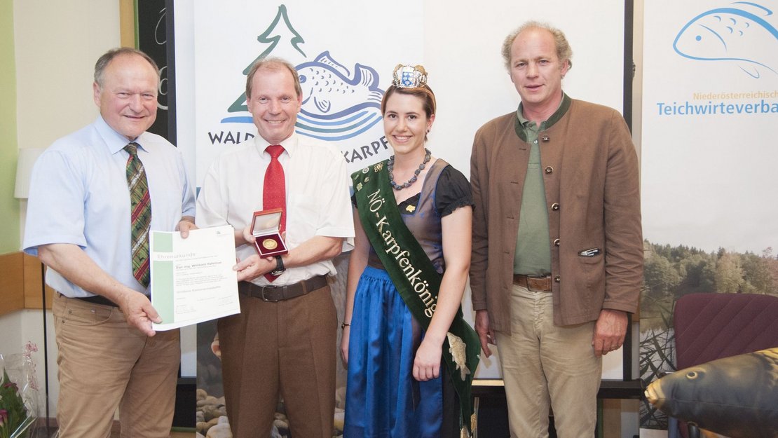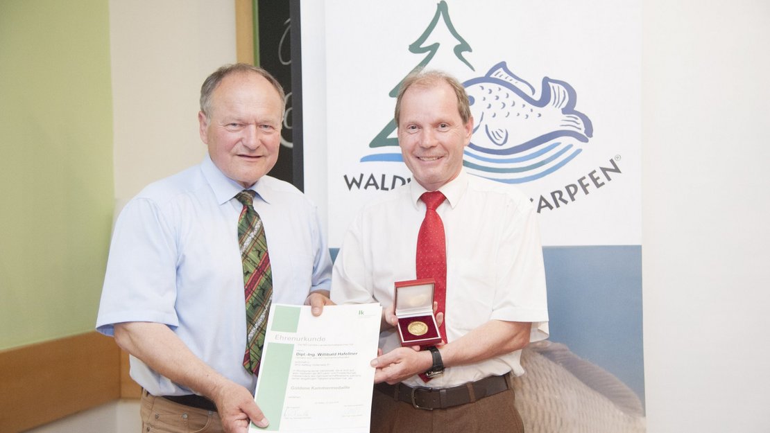 Für diese Verdienste um die Niederösterreichische Teichwirtschaft wurde Hafellner auch von Landwirtschaftskammer NÖ-Präsident Hermann Schultes mit der goldenen Kammermedaille ausgezeichnet. „Es braucht in jeder landwirtschaftlichen Sparte engagierte Persönlichkeiten, die die Herausforderungen der Zeit erkennen und aufzeigen. Mit Willibald Hafellner an der Spitze ist dem NÖ Teichwirteverband vieles gelungen und dazu möchte ich ihm gratulieren“, so Schultes. Auch Verbandsgeschäftsführer und LK Mitarbeiter Leo Kirchmaier lobt die gute Zusammenarbeit: „Obmann Hafellner war sicherlich ein Ausnahmetalent. Durch sein überbetriebliches Denken und sein ruhiges und wertschätzendes Auftreten ist er nicht nur unter den Teichwirten hoch angesehen sondern war auch bei den verschiedenen Behördenvertretern immer anerkannt und gerne gesehener Vertreter der Teichwirte.“