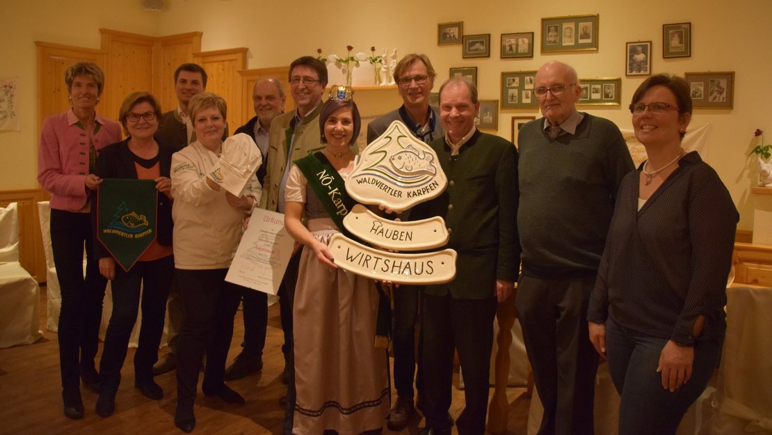 Als sichtbares äußeres Zeichen für den Karpfenwirt-Partnerbetrieb wurde dem Stadtwirtshaus Hopferl neben der bekannten Keramiktafel mit dem Sujet der geschützten Wort-Bild Marke „Waldviertler Karpfen“ nun auch die Zusatztafel „Hauben Wirtshaus“ verliehen. Den Gastronomen Monika und Josef Hag gebührt nun außerdem das Tragen der weißen Karpfenhaube mit dem aufgestickten Logo, eine Urkunde und ein Wimpel.