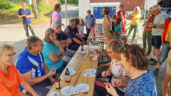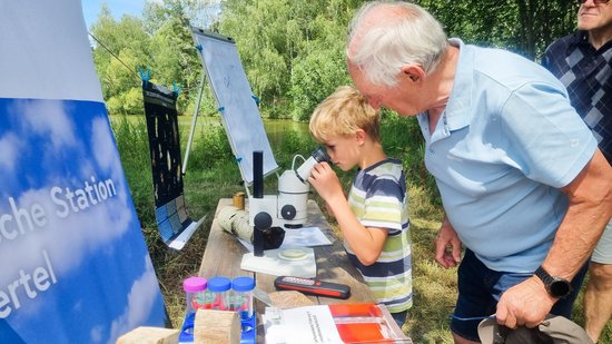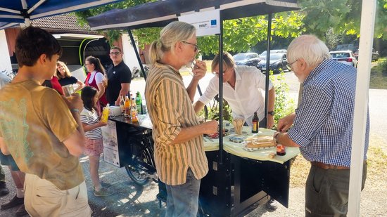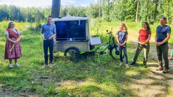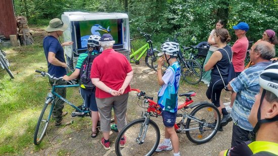 Sichtlich begeistert zeigten sich auch die Teilnehmer auf zwei Rädern anlässlich der CarpTrails von diesem Event. Die geführten Radtouren wurden von den beiden ausgebildeten Teichrangerinnen Regine Kainz und Elisabeth Peham fachlich betreut und spannten einen weiten Bogen aller Themenbereiche der Karpfenteichwirtschaft: von der Biodiversitätsfunktion, dem Wasserrückhalt in der Landschaft bis hin zum kulinarischen Aspekt durch eine Verkostung der Produkte, wie den in Öl eingelegten Karpfenhäppchen. Mittels Binokular konnte die faszinierende Unterwasserwelt genauestens unter die Lupe genommen werden. Ein wesentlicher Aspekt bei der teilweise auch spielerischen Auseinandersetzung mit den Themen waren die Lastenräder Karpfenkino, Karpfenküche und Karpfenkiste. Die NÖ Karpfenprinzessin reiste dabei standesgemäß per Rikscha mit der Karpfenkutsche an.