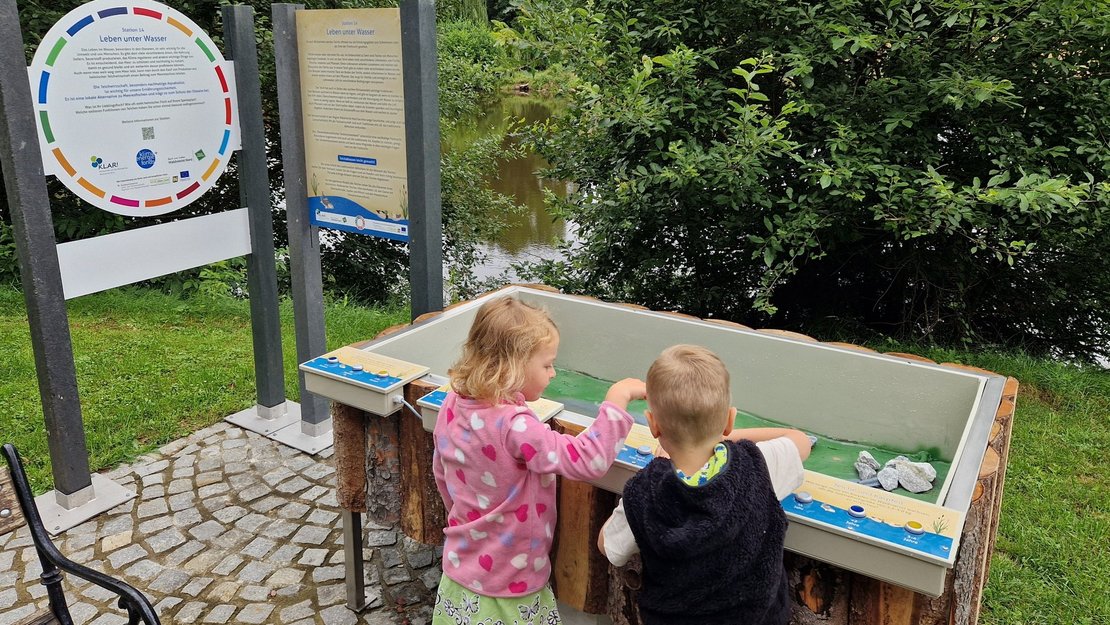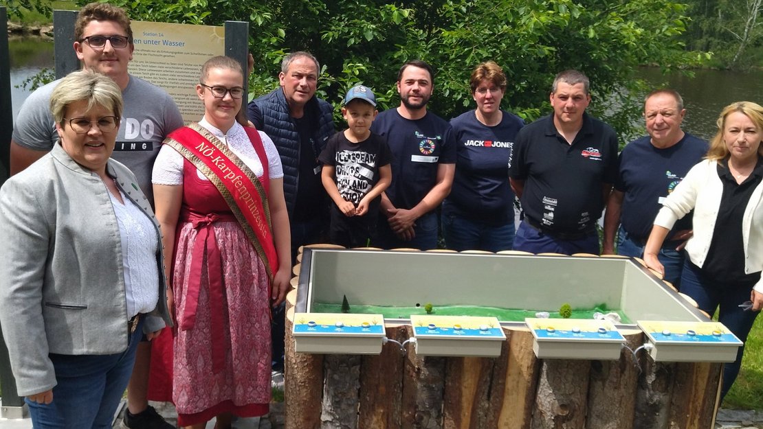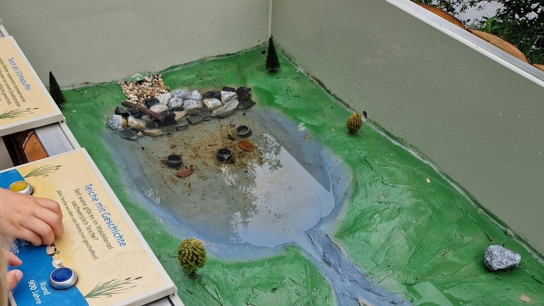 © Leo Kirchmaier Anhand eines Teichmodells wird gezeigt, dass Teiche dabei von Menschenhand geschaffen sind, ablassbar sind und eine Vielzahl an Leistungen für die Allgemeinheit erbringen. Diese drehen sich eben nicht nur um die Lebensmittelproduktion, sondern auch um Themen wie die positive Beeinflussung der Biodiversität oder des regionalen Kleinklimas. Dazu wird mittels Tauchpumpe Wasser aus dem nahen Gemeindeteich in das Teichmodell gepumpt, sobald Fragen rund um die Karpfenteichwirtschaft durch das Drücken der richtigen Knöpfe fachlich korrekt beantwortet wurden. Dadurch kann Wissensvermittlung spielerisch mit der Funktion von Teichen in Verbindung gebracht werden.