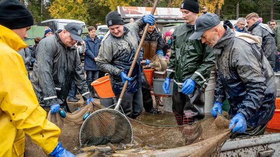 Zusätzlich zu den vielen Interessierten schauten auch Ehrengäste aus Politik und Verwaltung den Fischerinnen und Fischern bei der schweren Arbeit über die Schultern. Bundesrätin Margit Göll überbrachte in Vertretung von Landeshauptfrau Johanna Mikl-Leitner Grußworte. Dabei hob sie die Wichtigkeit der Teichwirtschaft für das Waldviertel hervor. Die Vizepräsidentin der NÖ Landes-Landwirtschaftskammer Andrea Wagner lobte die Teichwirtinnen und Teichwirte vor allem für den sorgsamen Umgang mit der Natur: „Beim Waldviertler Abfischfest kann man sich jedes Jahr davon überzeugen, wie naturnah der Waldviertler Karpfen wachsen darf und wie schonend und respektvoll beim traditionellen Abfischen mit dem Karpfen umgegangen wird. Nachhaltigkeit, Tierwohl und Lebensmittelproduktion gehen hier Hand in Hand.“ Auch Bezirkshauptmann-Stellvertreter Christoph Prinz, Bürgermeisterin Alexandra Weber und Bezirksbauernkammer-Obmann Markus Wandl überbrachten Grußworte.