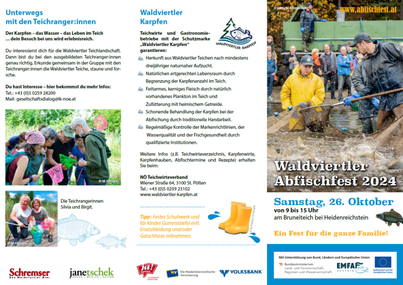Mitorganisator ist der NÖ Teichwirteverband. Ein wichtiger Tipp vom Verbandsgeschäftsführer Leo Kirchmaier „Bitte ziehen Sie Ihren Kindern Gummistiefel an, denn der Teichgrund ist spannend und faszinierend zugleich“, der dabei auch noch gut die eigenen Kindheitserinnerungen im Gedächtnis hat.