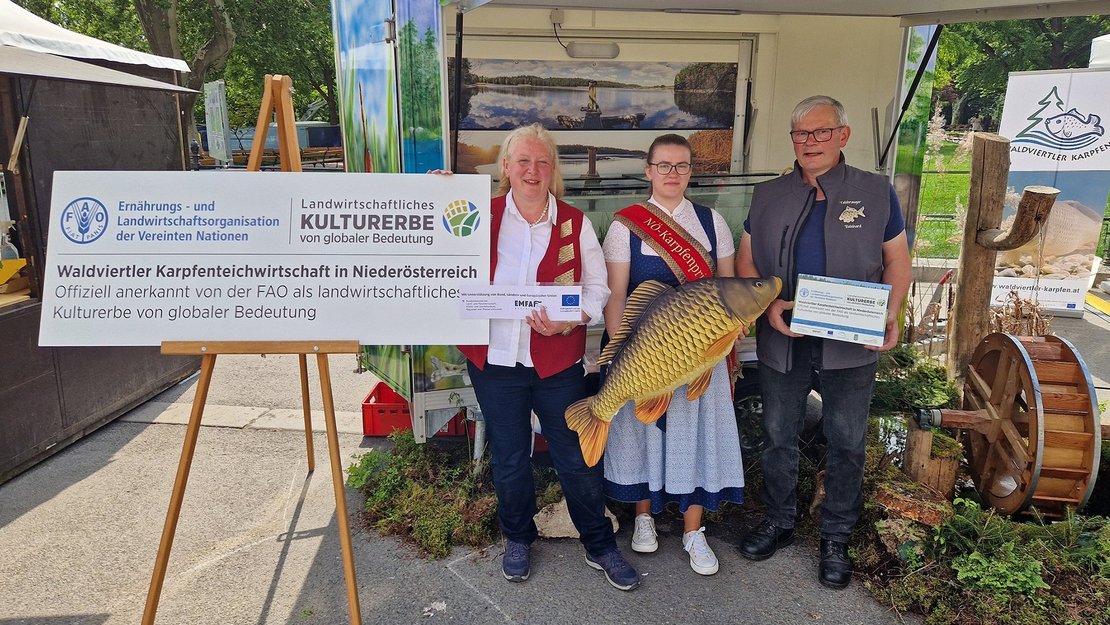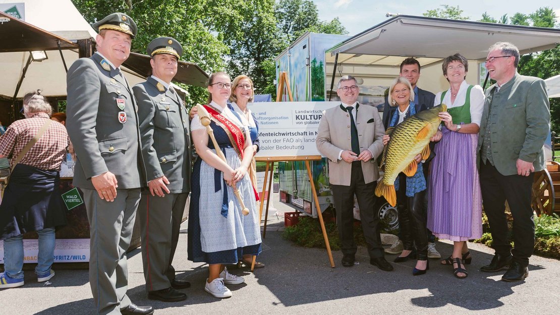 Ein besonderes Highlight war die kürzlich verliehene Auszeichnung der Waldviertler Karpfenteichwirtschaft als landwirtschaftliches Weltkulturerbe durch die Welternährungsorganisation (FAO). Diese höchste internationale Anerkennung für landwirtschaftliche Systeme würdigt die nachhaltige Bewirtschaftung, ökologische Vielfalt und kulturelle Bedeutung der Teichlandschaft im Waldviertel. Das offizielle Weltkulturerbe-Logo mit der Waldviertler Karpfenteichwirtschaft wurde durch Landeshauptfrau Johanna Mikl-Leitner, NÖ Karpfenprinzessin Michaela I., Verteidigungsministerin Klaudia Tanner, Finanzlandesrat Ludwig Schleritzko, Nationalrätin Martina Diesner-Wais und den beiden Geschäftsführern Tom Bauer (Destination Waldviertel) und Leo Kirchmaier (NÖ Teichwirteverband) auf der waldviertelpur enthüllt.