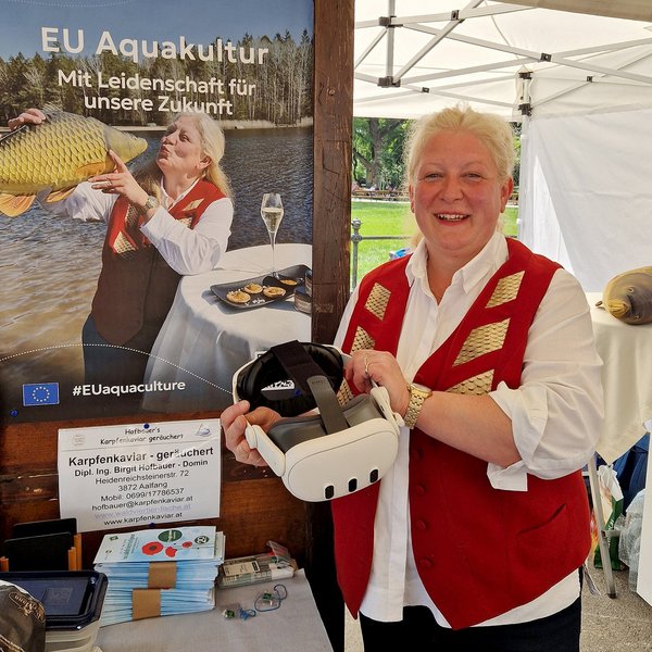 Die NÖ Karpfenprinzessin Michaela I. sowie die nationale Aquakulturbotschafterin Birgit Hofbauer-Domin präsentierten am Infostand den Stellenwert nachhaltiger Fischzucht in Österreich ganz im Sinne der aktuellen EU-Aquakulturkampagne. Die aktuelle EU-Kampagne zielt unter dem Motto „Mit Leidenschaft für unsere Zukunft“ darauf ab, durch ausgewählte Botschafter:innen auf eine bewusste, regionale und nachhaltige Fischproduktion aufmerksam zu machen. „Ein stärkeres Bewusstsein für heimischen Fisch liegt mir am Herzen. Dadurch minimieren wir Abhängigkeiten und fördern nachhaltige Systeme mit Mehrwert wie die Waldviertler Karpfenteichwirtschaft“, hob Hofbauer-Domin die Vorteile der verantwortungsbewussten heimischen Fischproduktion hervor. Mithilfe einer Virtual-Reality-Brille konnten Gäste die Waldviertler Karpfenteichwirtschaft mit dem Teichabfischen hautnah erleben. Teichranger und Karpfenliebhaber Reinhard Sprinzl zeigte auf der Bühne an allen drei Tagen die professionelle Zerlegung und Zubereitung des Karpfens.