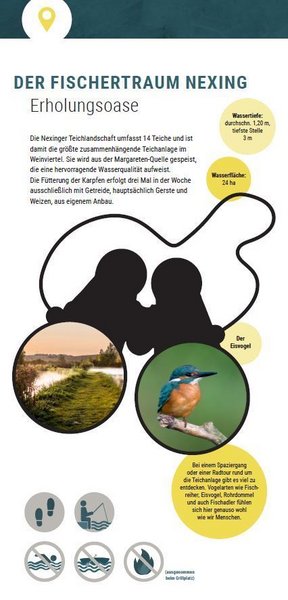 Die Nexinger Teichlandschaft umfasst 14 Teiche und ist damit die größte zusammenhängende Teichanlage im Weinviertel. Sie wird aus der Margareten-Quelle gespeist, die eine hervorragende Wasserqualität aufweist. Die Fütterung der Karpfen erfolgt drei Mal in der Woche ausschließlich mit Getreide, hauptsächlich Gerste und Weizen, aus eigenem Anbau.