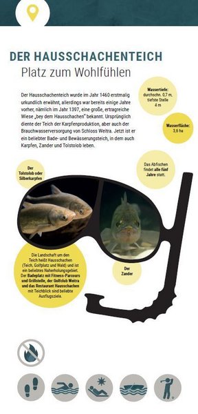 Der Hausschachenteich wurde im Jahr 1460 erstmalig urkundlich erwähnt, allerdings war bereits einige Jahre vorher, nämlich im Jahr 1397, eine große, ertragreiche Wiese „bey dem Hausschachen“ bekannt. Ursprünglich diente der Teich der Karpfenproduktion, aber auch der Brauchwasserversorgung von Schloss Weitra. Jetzt ist er ein beliebter Bade- und Bewässerungsteich, in dem auch Karpfen, Zander und Tolstolob leben.