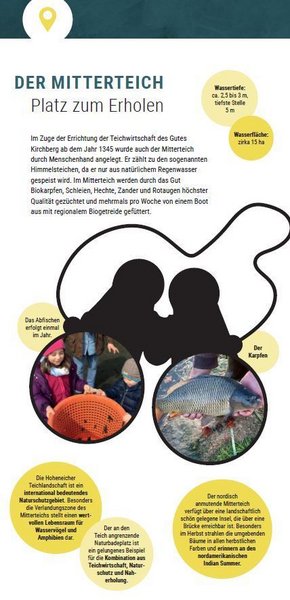 Im Zuge der Errichtung der Teichwirtschaft des Gutes Kirchberg ab dem Jahr 1345 wurde auch der Mitterteich durch Menschenhand angelegt. Er zählt zu den sogenannten Himmelsteichen, da er nur aus natürlichem Regenwasser gespeist wird. Im Mitterteich werden durch das Gut Biokarpfen, Schleien, Hechte, Zander und Rotaugen höchster Qualität gezüchtet und mehrmals pro Woche von einem Boot aus mit regionalem Biogetreide gefüttert.