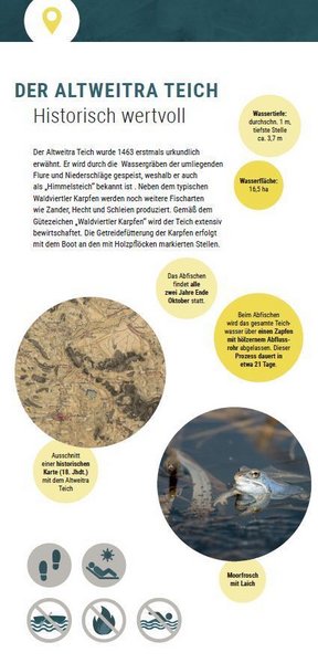 Der Altweitra Teich wurde 1463 erstmals urkundlich erwähnt. Er wird durch die Wassergräben der umliegenden Flure und Niederschläge gespeist, weshalb er auch als „Himmelsteich“ bekannt ist . Neben dem typischen Waldviertler Karpfen werden noch weitere Fischarten wie Zander, Hecht und Schleien produziert. Gemäß dem Gütezeichen „Waldviertler Karpfen“ wird der Teich extensiv bewirtschaftet. Die Getreidefütterung der Karpfen erfolgt mit dem Boot an den mit Holzpflöcken markierten Stellen.