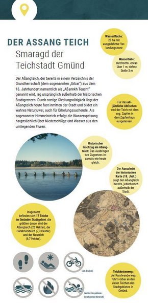 Der Aßangteich, der bereits in einem Verzeichnis der Grundherrschaft (dem sogenannten „Urbar“) aus dem 16. Jahrhundert namentlich als „Aßannkh Teucht“ genannt wird, lag ursprünglich außerhalb der historischen Stadtgrenzen. Durch stetige Siedlungstätigkeit liegt der Aßangteich heute fast inmitten der Stadt und bildet ein wahres Naturjuwel, auch für Erholungssuchende. Als sogenannter Himmelsteich erfolgt die Wasserspeisung hauptsächlich über Niederschläge und Wasser aus den umliegenden Fluren.