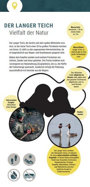 Der Langer Teich, der bereits seit dem späten Mittelalter existiert, ist der letzte Teich einer 20 ha großen Teichkette inmitten von Geras. Er zählt zu den sogenannten Himmelsteichen, da er hauptsächlich aus Regen- und Grundwasser gespeist wird. Neben dem Karpfen werden noch weitere Fischarten wie Schleie, Zander und Amur gehalten. Die Fische ernähren sich vorwiegend von Naturnahrung (Zooplankton), die ca. die Hälfte der Futtermenge ausmacht. Zusätzlich erfolgt die Fütterung ausschließlich mit Getreide aus der Region.