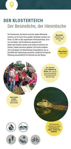 Der Klosterteich, der bereits seit dem späten Mittelalter existiert, ist Teil einer 20 ha großen Teichkette inmitten von Geras. Er zählt zu den sogenannten Himmelsteichen, da er nur aus Regen- und Grundwasser gespeist wird. Neben dem Karpfen werden noch weitere Fischarten wie Schleie, Zander und Amur gehalten. Die Fische ernähren sich vorwiegend von Naturnahrung (Zooplankton), die ca. die Hälfte der Futtermenge ausmacht. Zusätzlich erfolgt die Fütterung ausschließlich mit Getreide aus der Region.