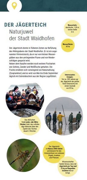 Der Jägerteich diente in früheren Zeiten zur Befüllung des Wehrgrabens der Stadt Waidhofen. Er ist ein sogenannter Himmelsteich, da er nur von kleinen Wassergräben aus den umliegenden Fluren und von Niederschlägen gespeist wird. Neben dem Karpfen werden noch weitere Fischarten wie Schleie, Zander und Weißfische gehalten. Die Fische ernähren sich vorwiegend von Naturnahrung (Zooplankton) und es wird von Mai bis Ende September täglich mit Getreideschrot aus der Region zugefüttert.