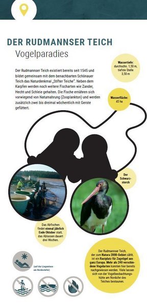 Der Rudmannser Teich existiert bereits seit 1545 und bildet gemeinsam mit dem benachbarten Schönauer Teich das Naturdenkmal „Stifter Teiche“. Neben dem Karpfen werden noch weitere Fischarten wie Zander, Hecht und Schleie gehalten. Die Fische ernähren sich vorwiegend von Naturnahrung (Zooplankton) und werden zusätzlich zwei bis dreimal wöchentlich mit Gerste gefüttert.