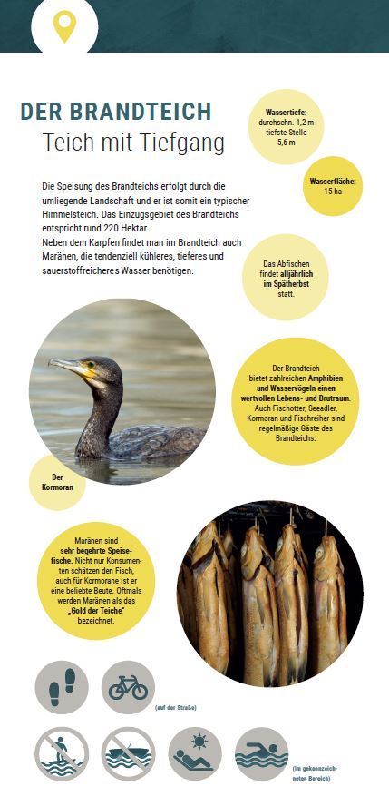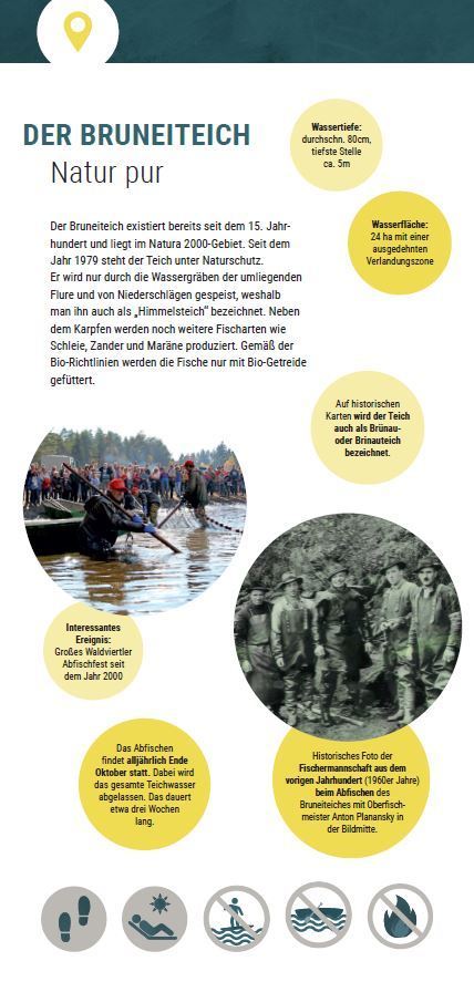 Der Bruneiteich existiert bereits seit dem 15. Jahrhundert und liegt im Natura 2000-Gebiet. Seit dem Jahr 1979 steht der Teich unter Naturschutz. Er wird nur durch die Wassergräben der umliegenden Flure und von Niederschlägen gespeist, weshalb man ihn auch als „Himmelsteich“ bezeichnet. Neben dem Karpfen werden noch weitere Fischarten wie Schleie, Zander und Maräne produziert. Gemäß der Bio-Richtlinien werden die Fische nur mit Bio-Getreide gefüttert.