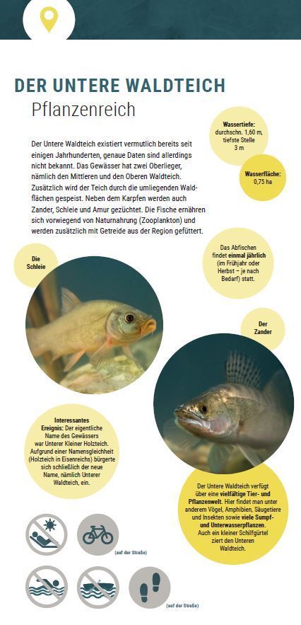Der Untere Waldteich existiert vermutlich bereits seit einigen Jahrhunderten, genaue Daten sind allerdings nicht bekannt. Das Gewässer hat zwei Oberlieger, nämlich den Mittleren und den Oberen Waldteich. Zusätzlich wird der Teich durch die umliegenden Waldflächen gespeist. Neben dem Karpfen werden auch Zander, Schleie und Amur gezüchtet. Die Fische ernähren sich vorwiegend von Naturnahrung (Zooplankton) und werden zusätzlich mit Getreide aus der Region gefüttert.