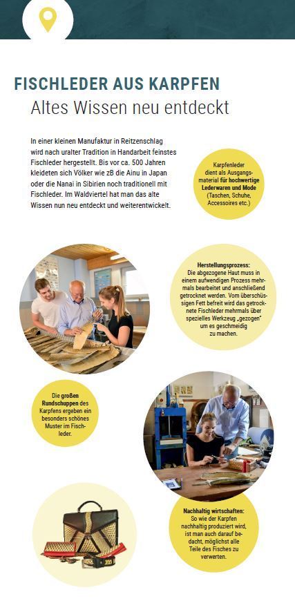 In einer kleinen Manufaktur in Reitzenschlag wird nach uralter Tradition in Handarbeit feinstes Fischleder hergestellt. Bis vor ca. 500 Jahren kleideten sich Völker wie zB die Ainu in Japan oder die Nanai in Sibirien noch traditionell mit Fischleder. Im Waldviertel hat man das alte Wissen nun neu entdeckt und weiterentwickelt.