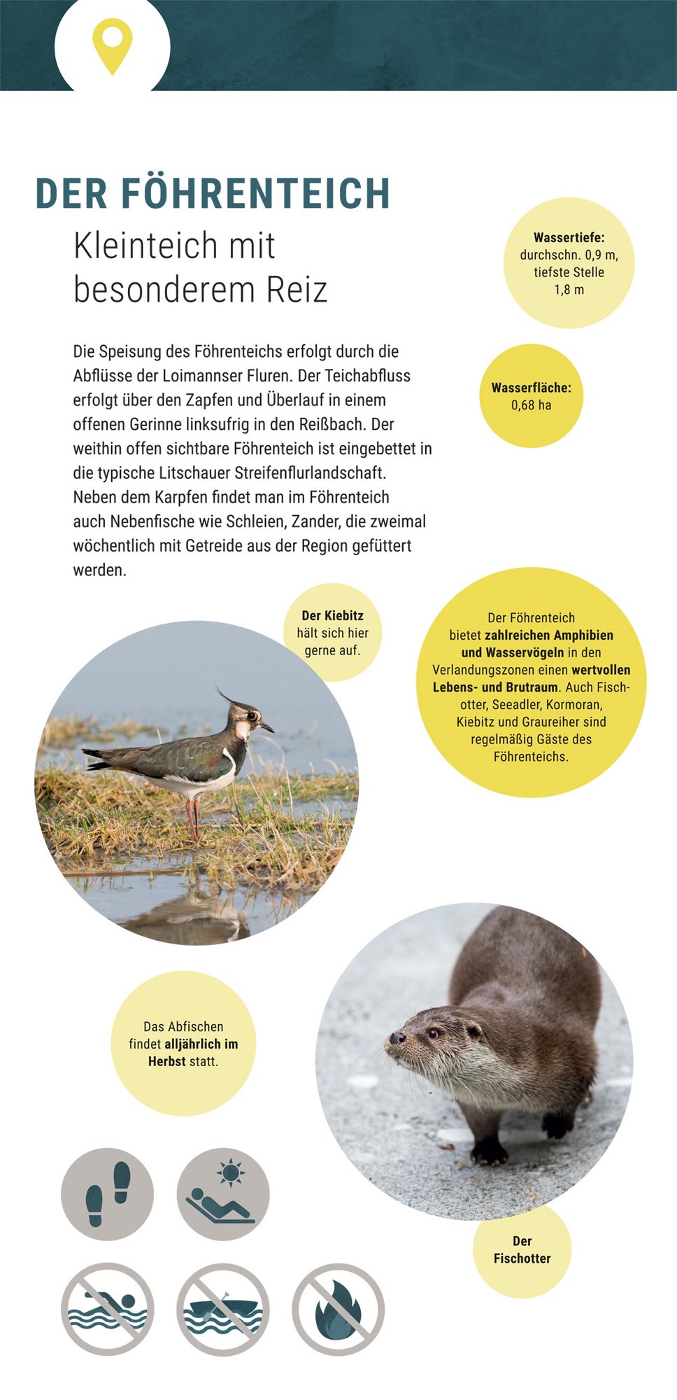 Die Speisung des Föhrenteichs erfolgt durch die Abflüsse der Loimannser Fluren. Der Teichabfluss erfolgt über den Zapfen und Überlauf in einem offenen Gerinne linksufrig in den Reißbach. Der weithin offen sichtbare Föhrenteich ist eingebettet in die typische Litschauer Streifenflurlandschaft. Neben dem Karpfen findet man im Föhrenteich auch Nebenfische wie Schleien, Zander, die zweimal wöchentlich mit Getreide aus der Region gefüttert werden.