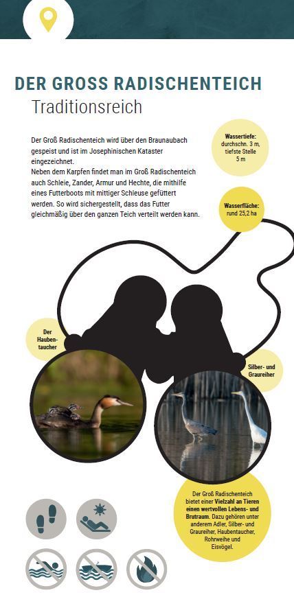 Der Groß Radischenteich wird über den Braunaubach gespeist und ist im Josephinischen Kataster eingezeichnet. Neben dem Karpfen findet man im Groß Radischenteich auch Schleie, Zander, Armur und Hechte, die mithilfe eines Futterboots mit mittiger Schleuse gefüttert werden. So wird sichergestellt, dass das Futter gleichmäßig über den ganzen Teich verteilt werden kann.