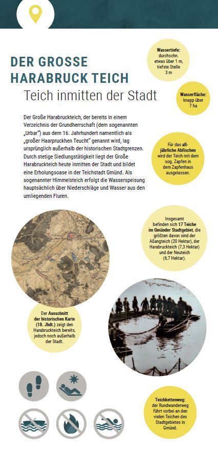 Der Große Harabruckteich, der bereits in einem Verzeichnis der Grundherrschaft (dem sogenannten „Urbar“) aus dem 16. Jahrhundert namentlich als „großer Haarpruckhen Teucht“ genannt wird, lag ursprünglich außerhalb der historischen Stadtgrenzen. Durch stetige Siedlungstätigkeit liegt der Große Harabruckteich heute inmitten der Stadt und bildet eine Erholungsoase in der Teichstadt Gmünd. Als sogenannter Himmelsteich erfolgt die Wasserspeisung hauptsächlich über Niederschläge und Wasser aus den umliegenden Fluren.
