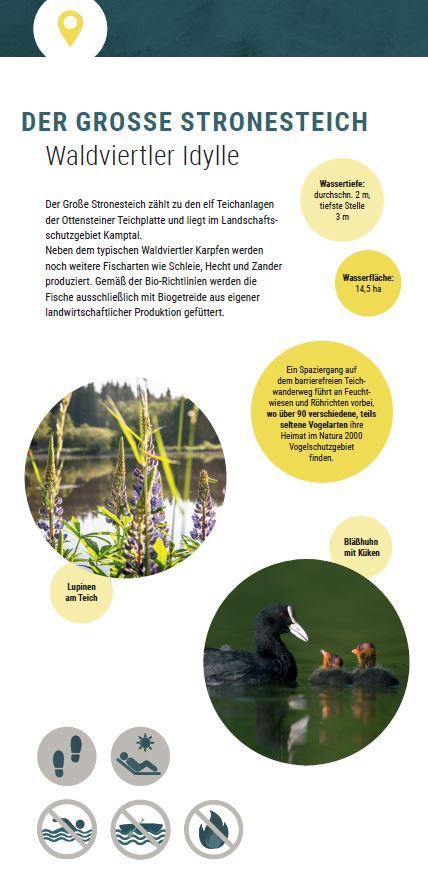 Der Große Stronesteich zählt zu den elf Teichanlagen der Ottensteiner Teichplatte und liegt im Landschaftsschutzgebiet Kamptal. Neben dem typischen Waldviertler Karpfen werden noch weitere Fischarten wie Schleie, Hecht und Zander produziert. Gemäß der Bio-Richtlinien werden die Fische ausschließlich mit Biogetreide aus eigener landwirtschaftlicher Produktion gefüttert.