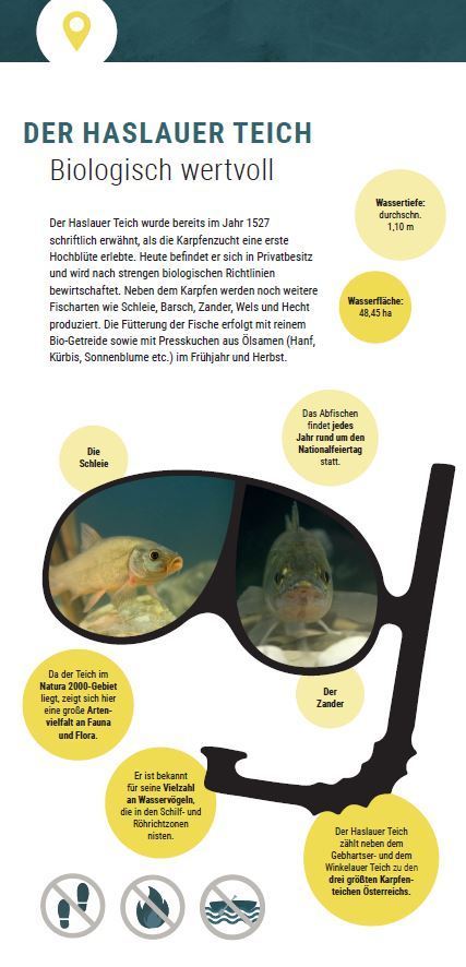 Der Haslauer Teich wurde bereits im Jahr 1527 schriftlich erwähnt, als die Karpfenzucht eine erste Hochblüte erlebte. Heute befindet er sich in Privatbesitz und wird nach strengen biologischen Richtlinien bewirtschaftet. Neben dem Karpfen werden noch weitere Fischarten wie Schleie, Barsch, Zander, Wels und Hecht produziert. Die Fütterung der Fische erfolgt mit reinem Bio-Getreide sowie mit Presskuchen aus Ölsamen (Hanf, Kürbis, Sonnenblume etc.) im Frühjahr und Herbst.