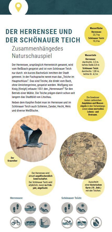 Der Herrensee, ursprünglich Herrenteich genannt, wird vom Reißbach gespeist und ist vom Schönauer Teich nur durch ein kurzes Bachstück inmitten der Stadt getrennt. In der Fachsprache nennt man das „Teiche im Hauptschluss“. Das sind Teiche, die direkt vom Bach, ohne Umleitergerinne, gespeist werden. Wolfgang von Kraig (Kreigh) erbaute 1551 den „Herrenwuerl“ für den Betrieb einer Mühle. Die Teiche prägen damit schon seit langem das Stadtbild von Litschau. Neben dem Karpfen findet man im Herrensee und im Schönauer Teich auch Schleien, Zander, Hecht, Wels und diverse Weißfische.