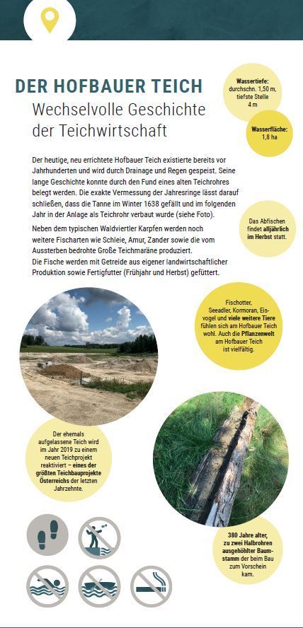 Der heutige, neu errichtete Hofbauer Teich existierte bereits vor Jahrhunderten und wird durch Drainage und Regen gespeist. Seine lange Geschichte konnte durch den Fund eines alten Teichrohres belegt werden. Die exakte Vermessung der Jahresringe lässt darauf schließen, dass die Tanne im Winter 1638 gefällt und im folgenden Jahr in der Anlage als Teichrohr verbaut wurde (siehe Foto). Neben dem typischen Waldviertler Karpfen werden noch weitere Fischarten wie Schleie, Amur, Zander sowie die vom Aussterben bedrohte Große Teichmaräne produziert. Die Fische werden mit Getreide aus eigener landwirtschaftlicher Produktion sowie Fertigfutter (Frühjahr und Herbst) gefüttert.