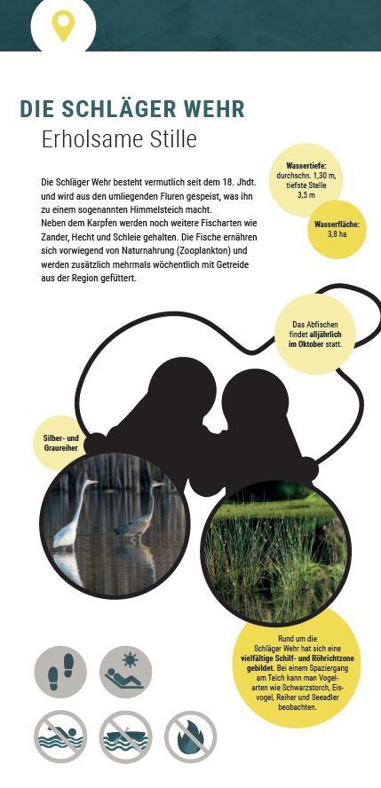 Die Schläger Wehr besteht vermutlich seit dem 18. Jhdt. und wird aus den umliegenden Fluren gespeist, was ihn zu einem sogenannten Himmelsteich macht. Neben dem Karpfen werden noch weitere Fischarten wie Zander, Hecht und Schleie gehalten. Die Fische ernähren sich vorwiegend von Naturnahrung (Zooplankton) und werden zusätzlich mehrmals wöchentlich mit Getreide aus der Region gefüttert.