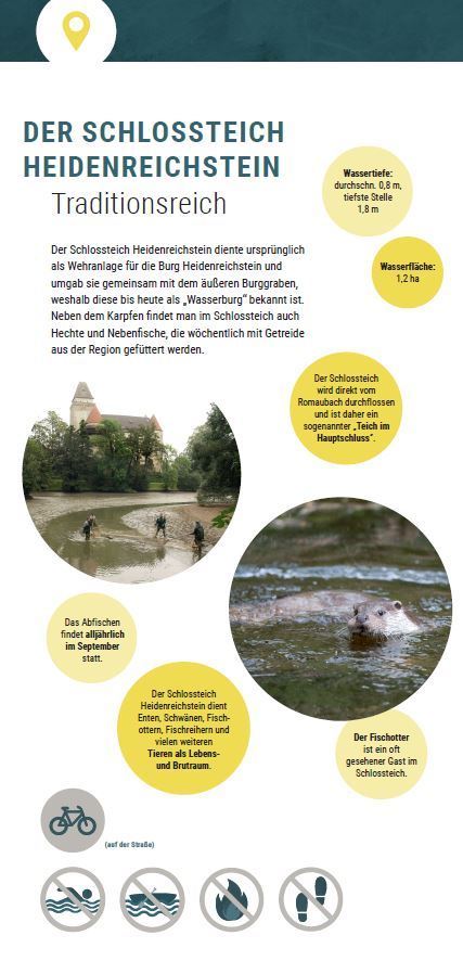Der Schlossteich Heidenreichstein diente ursprünglich als Wehranlage für die Burg Heidenreichstein und umgab sie gemeinsam mit dem äußeren Burggraben, weshalb diese bis heute als „Wasserburg“ bekannt ist. Neben dem Karpfen findet man im Schlossteich auch Hechte und Nebenfische, die wöchentlich mit Getreide aus der Region gefüttert werden.