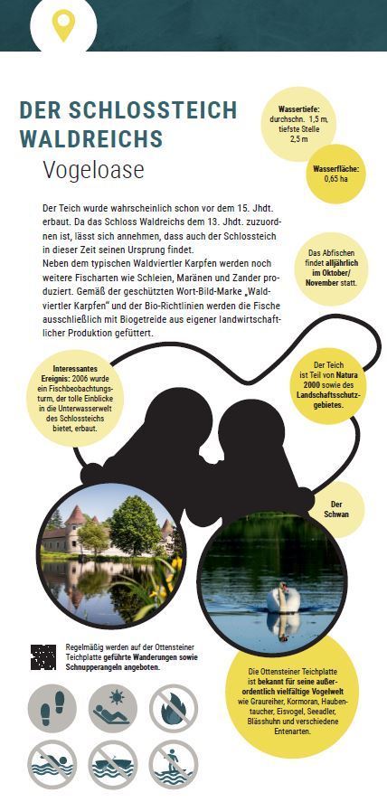 Der Teich wurde wahrscheinlich schon vor dem 15. Jhdt. erbaut. Da das Schloss Waldreichs dem 13. Jhdt. zuzuordnen ist, lässt sich annehmen, dass auch der Schlossteich in dieser Zeit seinen Ursprung findet. Neben dem typischen Waldviertler Karpfen werden noch weitere Fischarten wie Schleien, Maränen und Zander produziert. Gemäß der geschützten Wort-Bild-Marke „Waldviertler Karpfen“ und der Bio-Richtlinien werden die Fische ausschließlich mit Biogetreide aus eigener landwirtschaftlicher Produktion gefüttert.