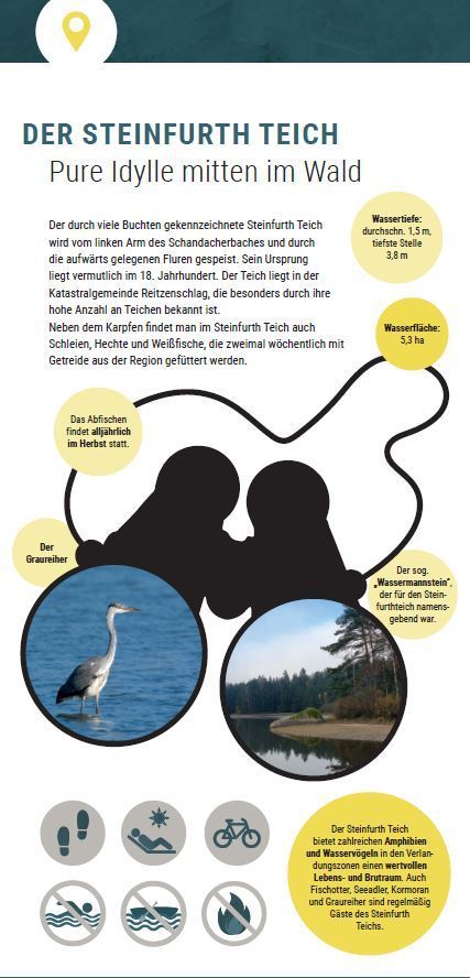 Der durch viele Buchten gekennzeichnete Steinfurth Teich wird vom linken Arm des Schandacherbaches und durch die aufwärts gelegenen Fluren gespeist. Sein Ursprung liegt vermutlich im 18. Jahrhundert. Der Teich liegt in der Katastralgemeinde Reitzenschlag, die besonders durch ihre hohe Anzahl an Teichen bekannt ist. Neben dem Karpfen findet man im Steinfurth Teich auch Schleien, Hechte und Weißfi sche, die zweimal wöchentlich mit Getreide aus der Region gefüttert werden.