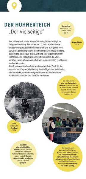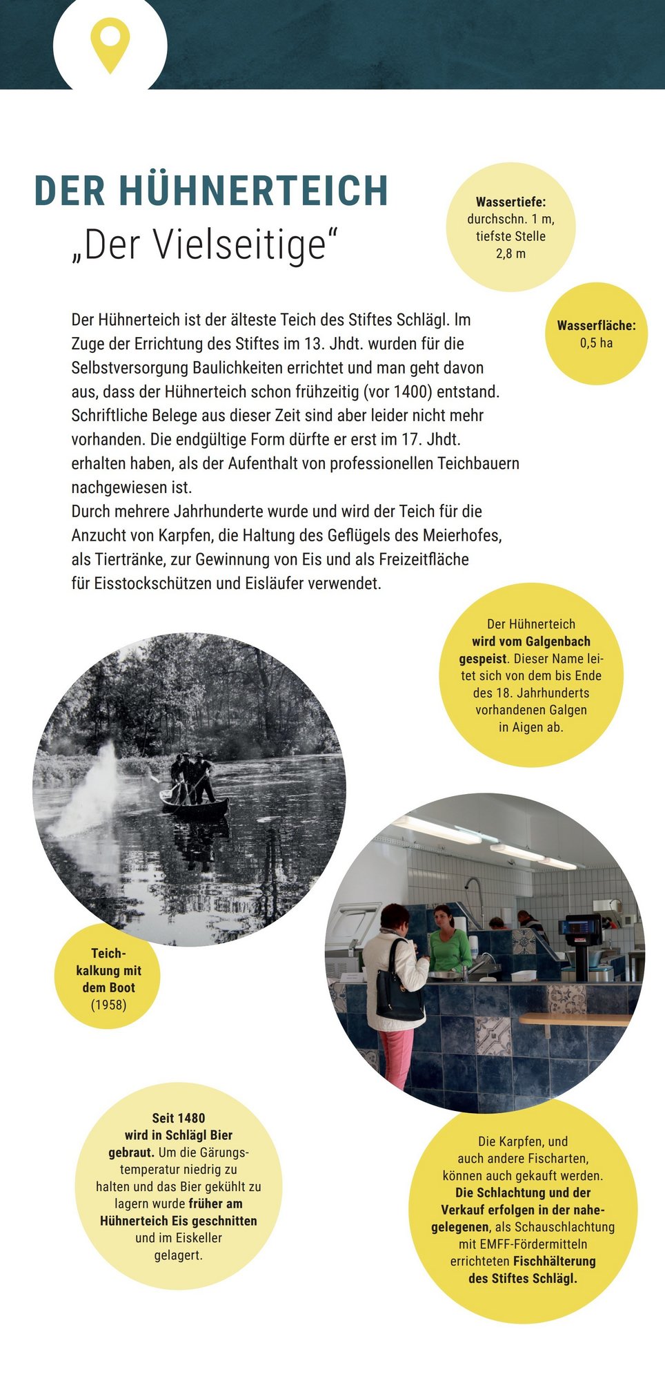 Der Hühnerteich ist der älteste Teich des Stiftes Schlägl. lm Zuge der Errichtung des Stiftes im 13. Jhdt. wurden für die Selbstversorgung Baulichkeiten errichtet und man geht davon aus, dass der Hühnerteich schon frühzeitig (vor 1400) entstand. Schriftliche Belege aus dieser Zeit sind aber leider nicht mehr vorhanden. Die endgültige Form dürfte er erst im 17. Jhdt. erhalten haben, als der Aufenthalt von professionellen Teichbauern nachgewiesen ist. Durch mehrere Jahrhunderte wurde und wird der Teich für die Anzucht von Karpfen, die Haltung des Geflügels des Meierhofes, als Tiertränke, zur Gewinnung von Eis und als Freizeitfläche für Eisstockschützen und Eisläufer verwendet.