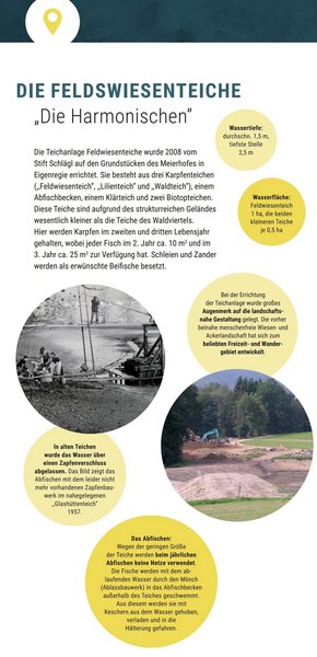 Die Teichanlage Feldwiesenteiche wurde 2008 vom Stift Schlägl auf den Grundstücken des Meierhofes in Eigenregie errichtet. Sie besteht aus drei Karpfenteichen (,,Feldwiesenteich“, ,,Lilienteich“ und ,,Waldteich“), einem Abfischbecken, einem Klärteich und zwei Biotopteichen. Diese Teiche sind aufgrund des strukturreichen Geländes wesentlich kleiner als die Teiche des Waldviertels. Hier werden Karpfen im zweiten und dritten Lebensjahr gehalten, wobei jeder Fisch im 2. Jahr ca. 10 m2 und im 3. Jahr ca. 25 m2 zur Verfügung hat. Schleien und Zander werden als erwünschte Beifische besetzt.