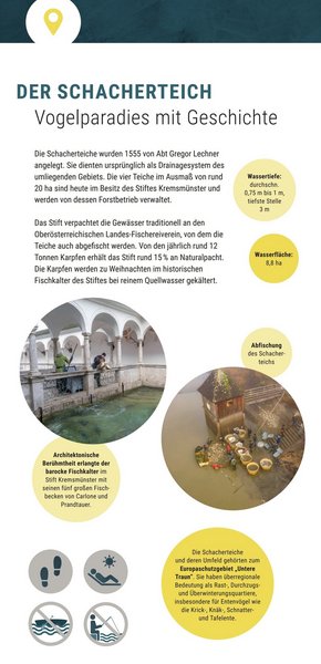Die Schacherteiche wurden 1555 von Abt Gregor Lechner angelegt. Sie dienten ursprünglich als Drainagesystem des umliegenden Gebiets. Die vier Teiche im Ausmaß von rund 20 ha sind heute im Besitz des Stiftes Kremsmünster und werden von dessen Forstbetrieb verwaltet. Das Stift verpachtet die Gewässer traditionell an den Oberösterreichischen Landes-Fischereiverein, von dem die Teiche auch abgefischt werden. Von den jährlich rund 12 Tonnen Karpfen erhält das Stift rund 15 % an Naturalpacht. Die Karpfen werden zu Weihnachten im historischen Fischkalter des Stiftes bei reinem Quellwasser gekältert.