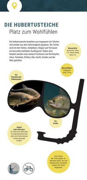 Die Hubertusteiche bestehen aus insgesamt vier Teichen und werden aus dem Schirningbach gespeist. Die Teiche sind mit den Hütten, Zeltplätzen, Stegen und Terrassen ein besonders beliebtes Ausflugsziel. Neben dem Karpfen werden noch weitere Fischarten wie Koi-Karpfen, Amur, Tolstolob, Schleie, Stör, Hecht, Zander und der Wels gehalten.