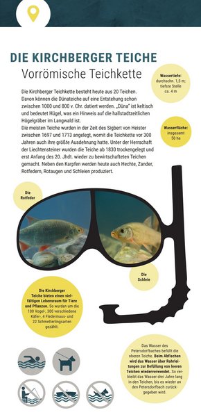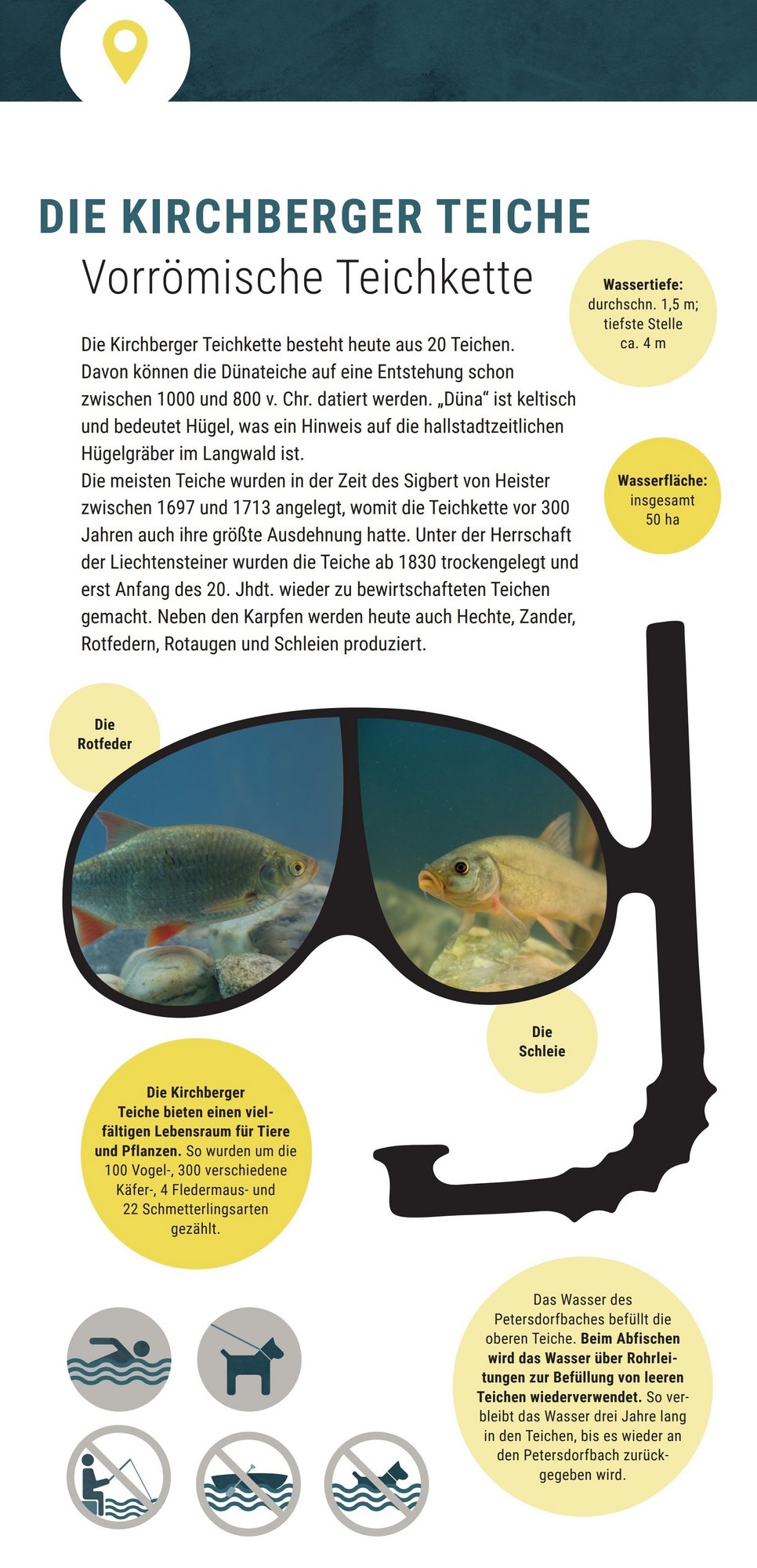 Die Kirchberger Teichkette besteht heute aus 20 Teichen. Davon können die Dünateiche auf eine Entstehung schon zwischen 1000 und 800 v. Chr. datiert werden. „Düna“ ist keltisch und bedeutet Hügel, was ein Hinweis auf die hallstadtzeitlichen Hügelgräber im Langwald ist. Die meisten Teiche wurden in der Zeit des Sigbert von Heister zwischen 1697 und 1713 angelegt, womit die Teichkette vor 300 Jahren auch ihre größte Ausdehnung hatte. Unter der Herrschaft der Liechtensteiner wurden die Teiche ab 1830 trockengelegt und erst Anfang des 20. Jhdt. wieder zu bewirtschafteten Teichen gemacht. Neben den Karpfen werden heute auch Hechte, Zander, Rotfedern, Rotaugen und Schleien produziert.