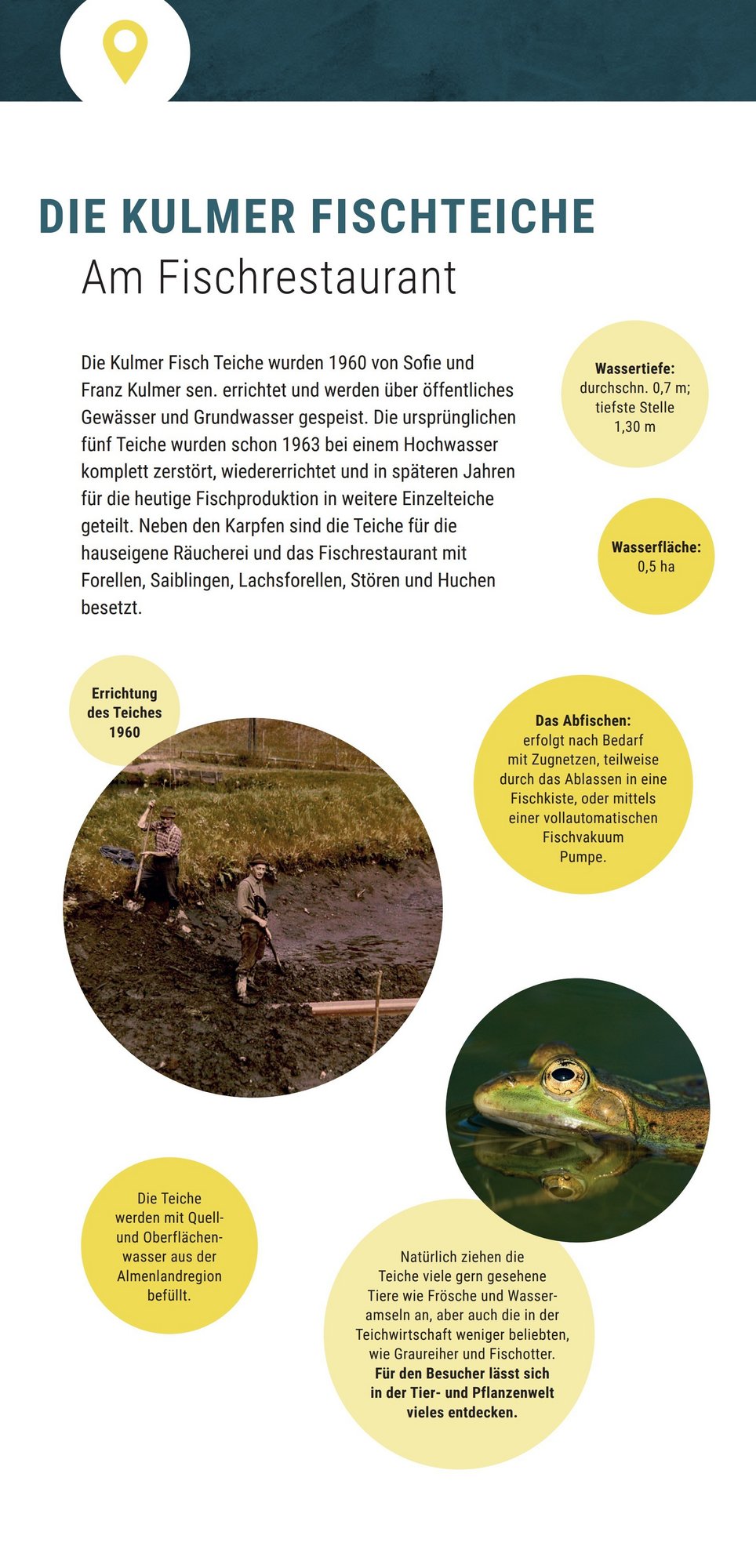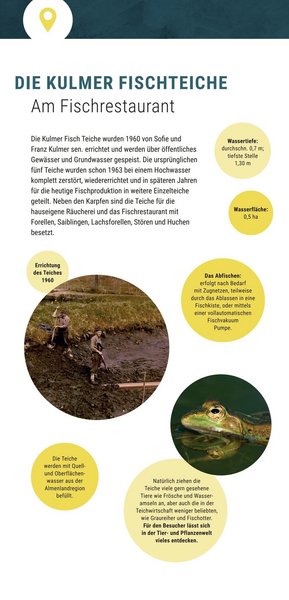 Die Kulmer Fisch Teiche wurden 1960 von Sofie und Franz Kulmer sen. errichtet und werden über öffentliches Gewässer und Grundwasser gespeist. Die ursprünglichen fünf Teiche wurden schon 1963 bei einem Hochwasser komplett zerstört, wiedererrichtet und in späteren Jahren für die heutige Fischproduktion in weitere Einzelteiche geteilt. Neben den Karpfen sind die Teiche für die hauseigene Räucherei und das Fischrestaurant mit Forellen, Saiblingen, Lachsforellen, Stören und Huchen besetzt.