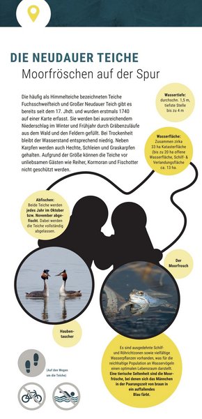 Die häufig als Himmelteiche bezeichneten Teiche Fuchsschweifteich und Großer Neudauer Teich gibt es bereits seit dem 17. Jhdt. und wurden erstmals 1740 auf einer Karte erfasst. Sie werden bei ausreichendem Niederschlag im Winter und Frühjahr durch Gräbenzuläufe aus dem Wald und den Feldern gefüllt. Bei Trockenheit bleibt der Wasserstand entsprechend niedrig. Neben Karpfen werden auch Hechte, Schleien und Graskarpfen gehalten. Aufgrund der Größe können die Teiche vor unliebsamen Gästen wie Reiher, Kormoran und Fischotter nicht geschützt werden.
