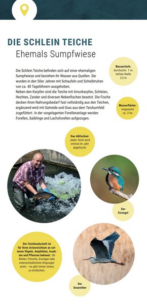 Die Schlein Teiche befinden sich auf einer ehemaligen Sumpfwiese und beziehen ihr Wasser aus Quellen. Sie wurden in den 50er Jahren mit Schaufeln und Scheibtruhen von ca. 40 Tagelöhnern ausgehoben. Neben den Karpfen sind die Teiche mit Amurkarpfen, Schleien, Hechten, Zander und diversen Nebenfischen besetzt. Die Fische decken ihren Nahrungsbedarf fast vollständig aus den Teichen, ergänzend wird mit Getreide und Gras aus dem Teichumfeld zugefüttert. In der vorgelagerten Forellenanlage werden Forellen, Saiblinge und Lachsforellen aufgezogen.