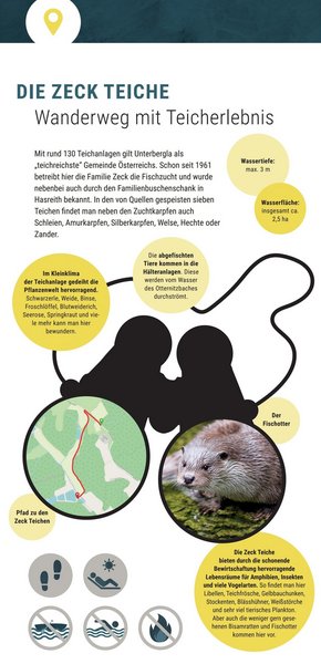 Mit rund 130 Teichanlagen gilt Unterbergla als „teichreichste“ Gemeinde Österreichs. Schon seit 1961 betreibt hier die Familie Zeck die Fischzucht und wurde nebenbei auch durch den Familienbuschenschank in Hasreith bekannt. In den von Quellen gespeisten sieben Teichen findet man neben den Zuchtkarpfen auch Schleien, Amurkarpfen, Silberkarpfen, Welse, Hechte oder Zander.