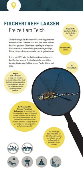 Die Teichanlage des Fischertreff Laasen liegt in einem wunderschönen Talkessel und wird über einen kleinen Bachlauf gespeist. Über die gut gepflegten Wege und Brücken erreicht man auf der ganzen Anlage ruhige Plätze, die zum Entspannen oder zum Angeln einladen. Schon seit 1975 wird der Teich mit Friedfischen und Raubfischen besetzt. Zu den Besatzfischen zählen Karpfen, Koikarpfen, Schleie, Amur, Zander, Hecht und Wels.