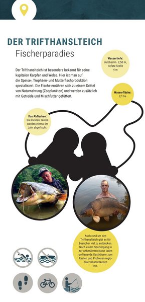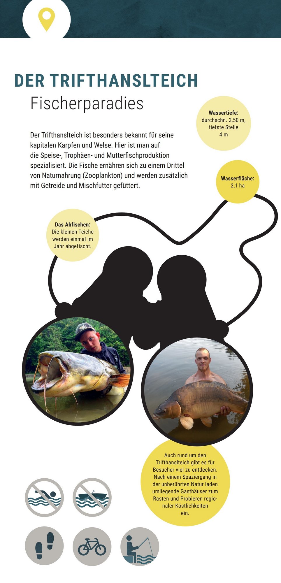 Der Trifthanslteich ist besonders bekannt für seine kapitalen Karpfen und Welse. Hier ist man auf die Speise-, Trophäen- und Mutterfischproduktion spezialisiert. Die Fische ernähren sich zu einem Drittel von Naturnahrung (Zooplankton) und werden zusätzlich mit Getreide und Mischfutter gefüttert.