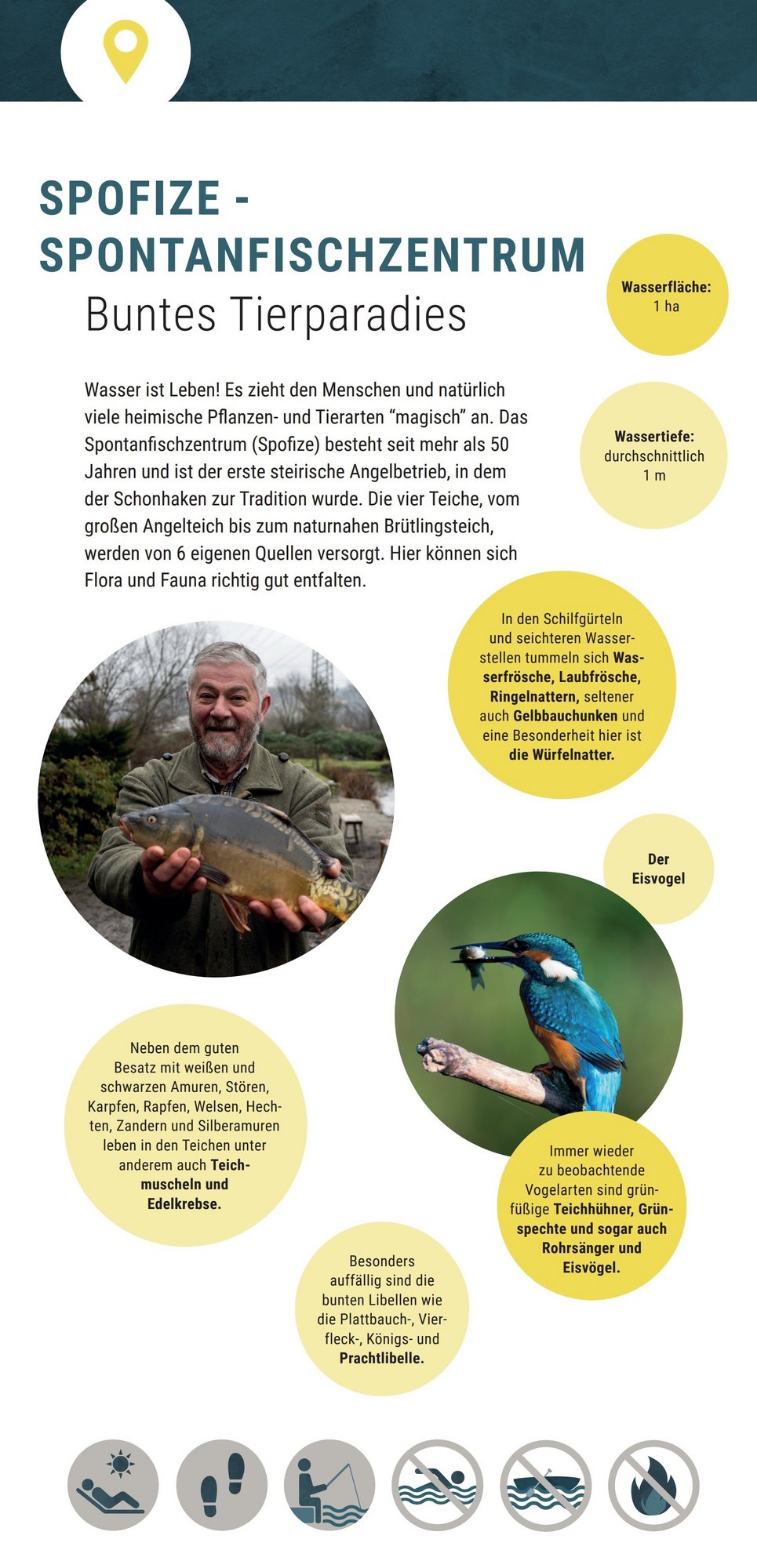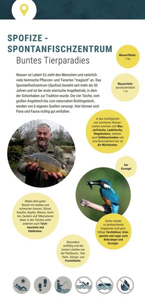 Wasser ist Leben! Es zieht den Menschen und natürlich viele heimische Pflanzen- und Tierarten “magisch” an. Das Spontanfischzentrum (Spofize) besteht seit mehr als 50 Jahren und ist der erste steirische Angelbetrieb, in dem der Schonhaken zur Tradition wurde. Die vier Teiche, vom großen Angelteich bis zum naturnahen Brütlingsteich, werden von 6 eigenen Quellen versorgt. Hier können sich Flora und Fauna richtig gut entfalten.
