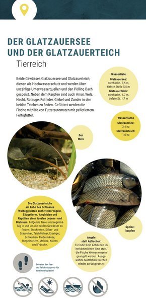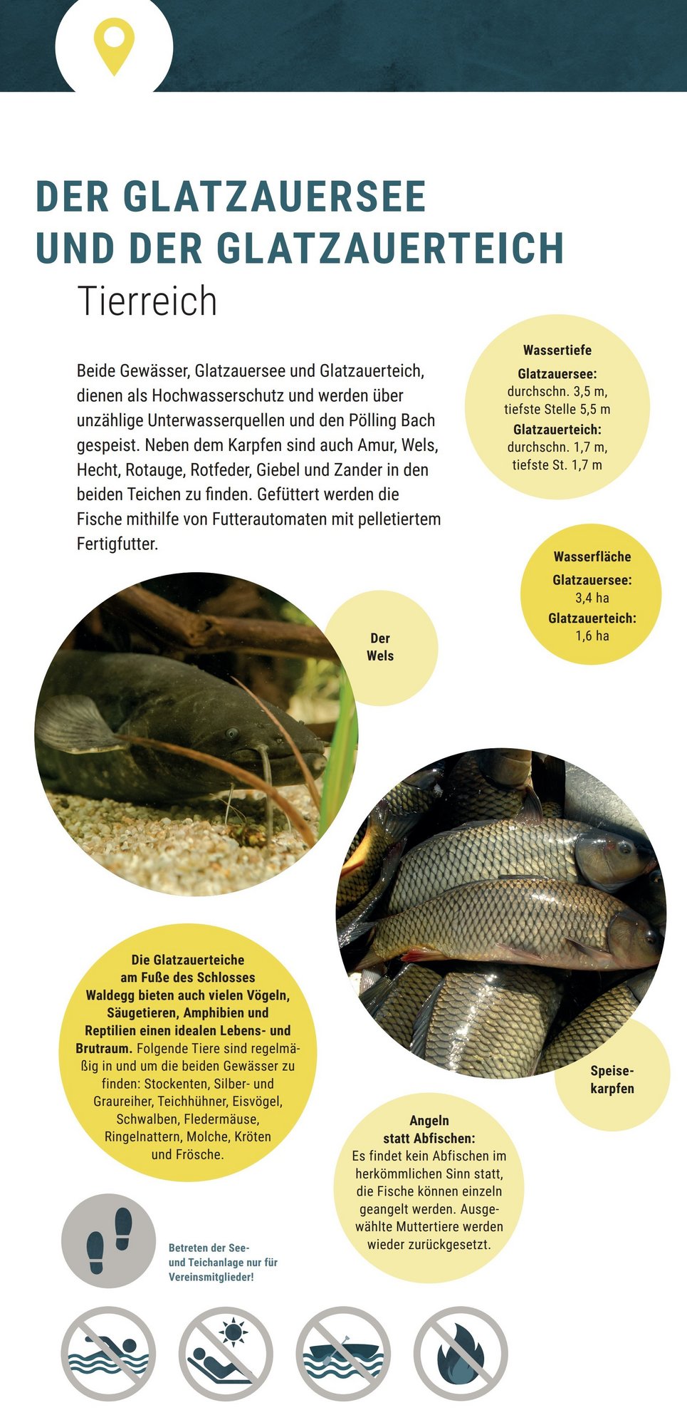 Beide Gewässer, Glatzauersee und Glatzauerteich, dienen als Hochwasserschutz und werden über unzählige Unterwasserquellen und den Pölling Bach gespeist. Neben dem Karpfen sind auch Amur, Wels, Hecht, Rotauge, Rotfeder, Giebel und Zander in den beiden Teichen zu finden. Gefüttert werden die Fische mithilfe von Futterautomaten mit pelletiertem Fertigfutter.